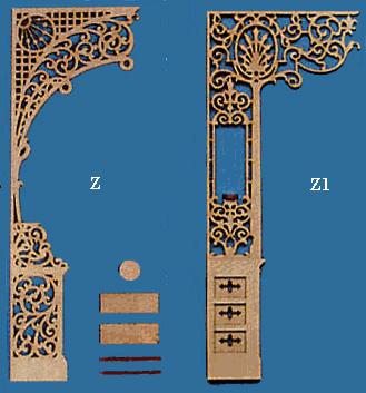 These delicately detailed trims are produced by state of the art laser technology. They are easy to install and require very little extra preparation. Adjustable trims, pictured below, can be used in apexes with wide or narrow angles. Detailed porch trims can also be used as corbel brackets or accents for crown molding. All of these pieces are made from 3/32" basswood and proudly made in the USA.